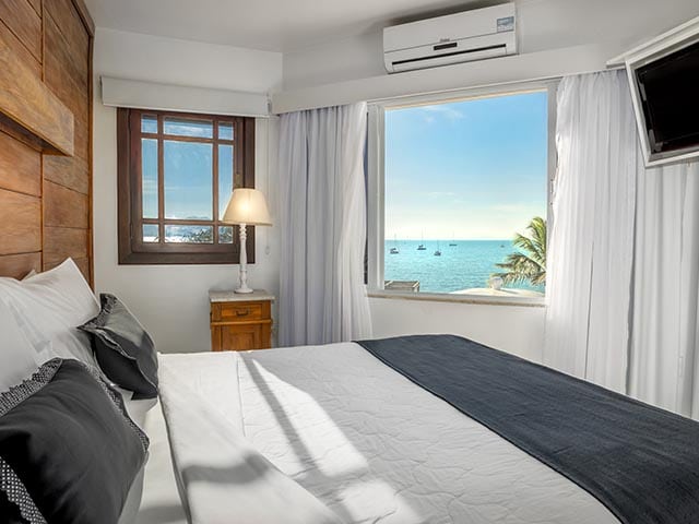 01 quarto com cama de casal (box spring), TV LCD 26″ (a cabo), sacada fechada com vista para o mar, ar-condicionado tipo Split e ventilador de teto;